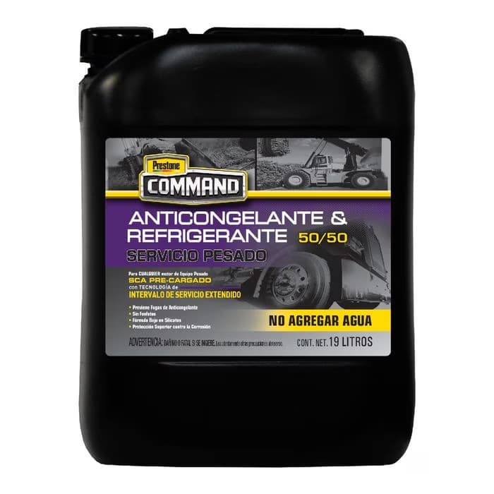 Prestone® Command® Anticongelante & Refrigerante para Equipo Pesado está formulado con avanzada tecnología de protección contra la corrosión. Esto proporciona un excepcional producto con Tecnología de Intervalo de Servicio Extendido (ESI) y SCA precargados que es compatible con CUALQUIER refrigerante convencional para equipo pesado y TODAS las tecnologías de filtro.
